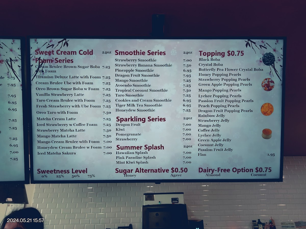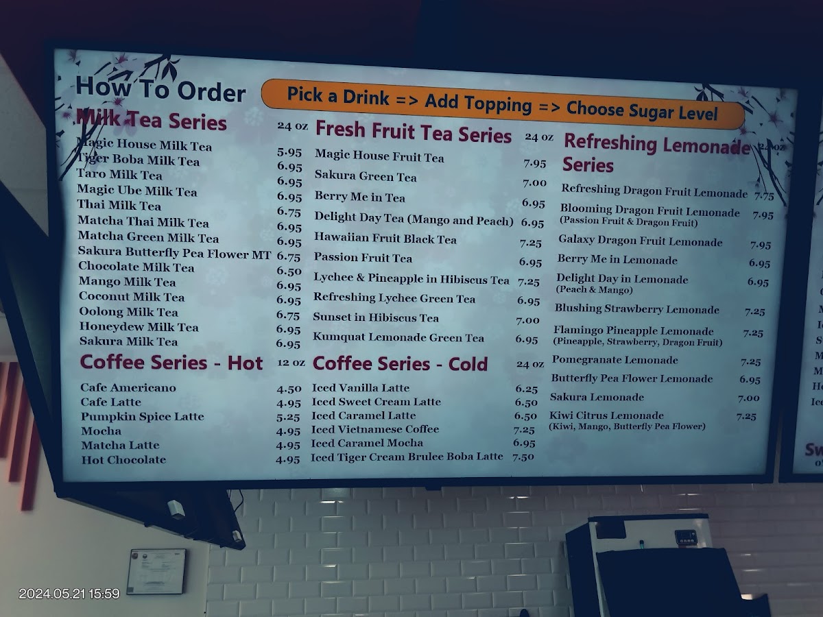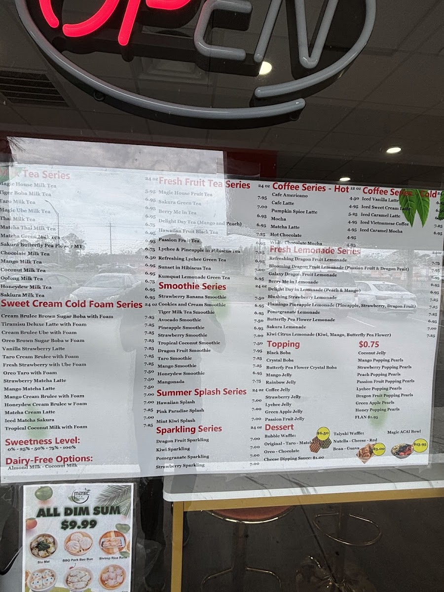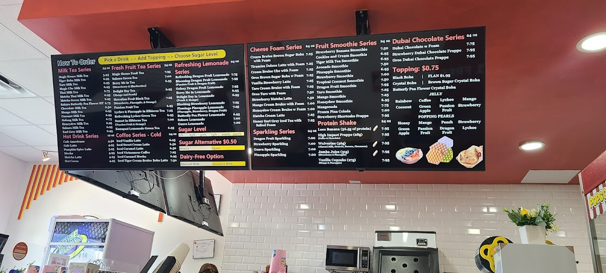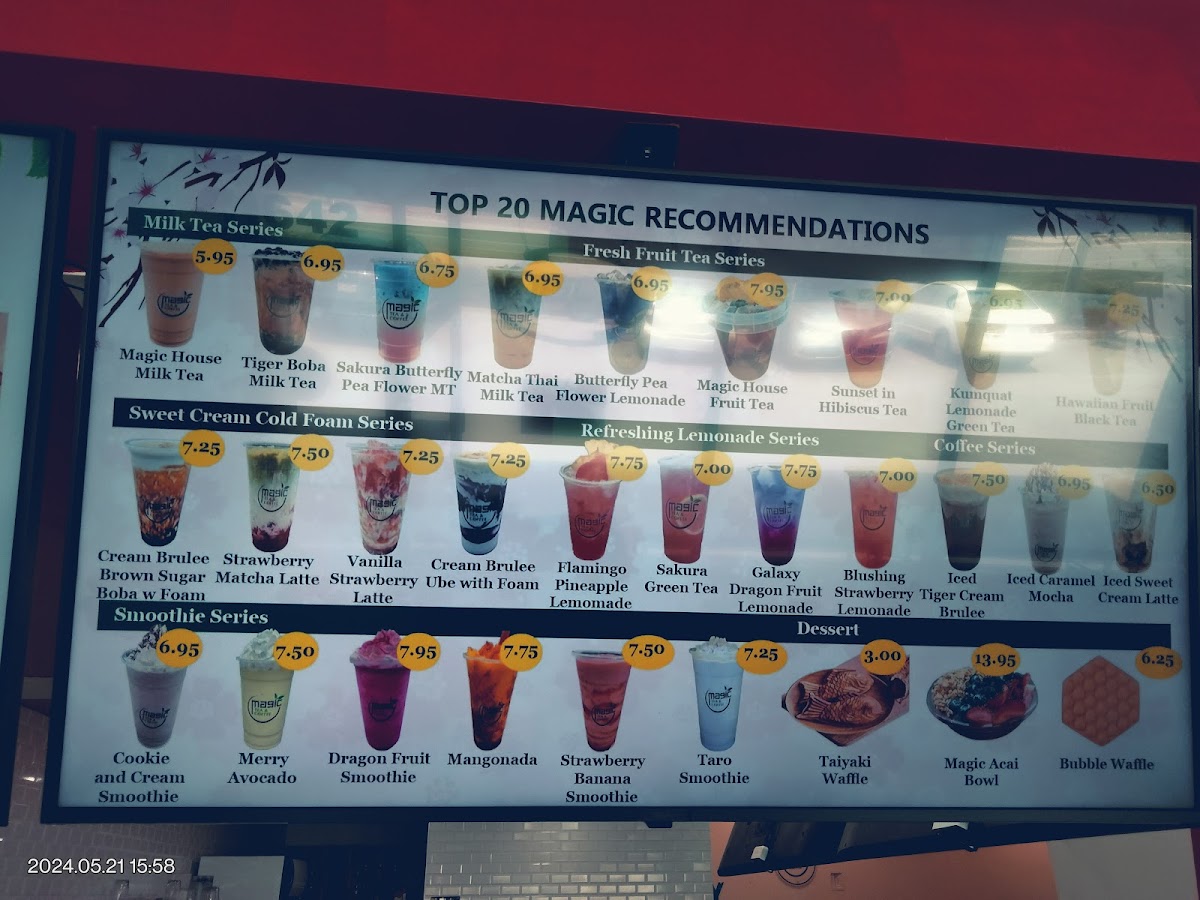 Magic Tea And Coffee's menu offers an impressive variety of beverages and treats, catering to diverse tastes. The Matcha Series features standout options like the Triple Matcha Latte ($5.50), Matcha Chocolate Latte ($5.50), and Mango Matcha Latte ($5.75). For those craving milk tea, options like the Mango Milk Tea ($5.25) and Magic Ube Milk Tea ($5.50) are popular choices. Ice cream lovers can indulge in the refreshing Boba Ice Cream ($3.99) or the exotic Strawberry Dubai Ice Cream ($4.25). Seasonal offerings include the comforting Brown Sugar Pumpkin Spice Latte with Foam ($5.75) and the Pumpkin Spice Iced Tea with Cinnamon Foam ($5.25).